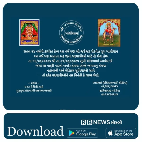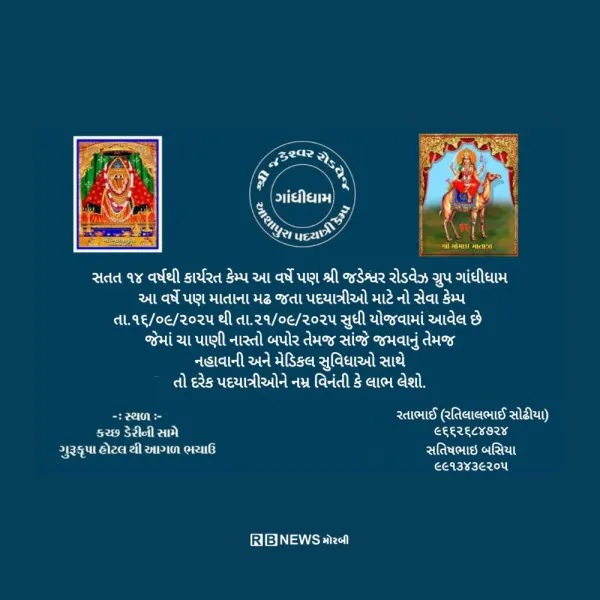 ભચાઉ (કચ્છ): કચ્છમાં મા આશાપુરાના દર્શનાર્થે જતા પદયાત્રીઓ માટે સેવા અને સહાય પૂરી પાડવા માટે શ્રી જડેશ્વર રોડવેઝ ગ્રુપ, ગાંધીધામ દ્વારા આયોજન કરવામાં આવ્યું છે. સંસ્થા દ્વારા સતત 14મા વર્ષે આ સેવા કેમ્પનું આયોજન કરવામાં આવ્યું છે.