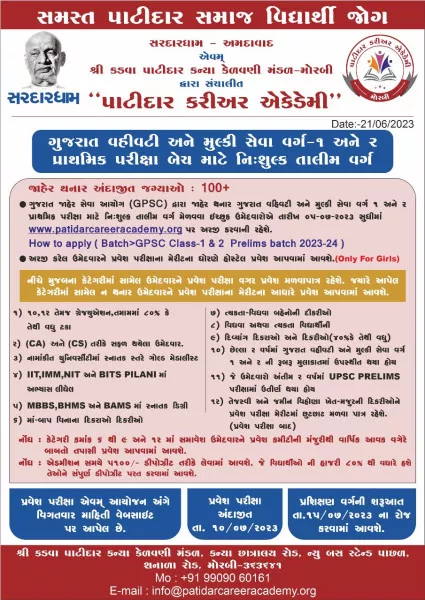 સરદારધામ – અમદાવાદ એવમ્ શ્રી કડવા પાટીદાર કન્યા કેળવણી મંડળ દ્વારા સંચાલિત મોરબી સ૨દા૨ધામ “પાટીદાર કરીઅર એકેડેમી ખાતે GPSC Class 1&2 Prelims પરીક્ષા માટે નિ: શુલ્ક તાલીમ વર્ગ શરૂ કરવામાં આવશે